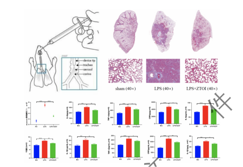 在脂多糖(LPS)诱导的大鼠重症急性肺损伤(ALI)模型中,莪术油注射液可显著减轻大鼠肺部出血、炎症浸润和实质化等病理改变;可显著降低大鼠肺湿/干重比及CRP含量,可改善因LPS引起的肺组织水肿和炎症,对细菌引起的模型具有治疗作用;有效抑制大鼠血清和肺组织中TNF-α、IL-1β和IL-6合成。