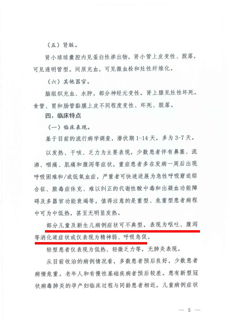 第七版更新幅度较大,其中增加了对儿童的临床表现描述:部分儿童及新生儿病例症状可不典型,表现为呕吐、腹泻等消化道症状或仅表现为精神弱、呼吸急促。