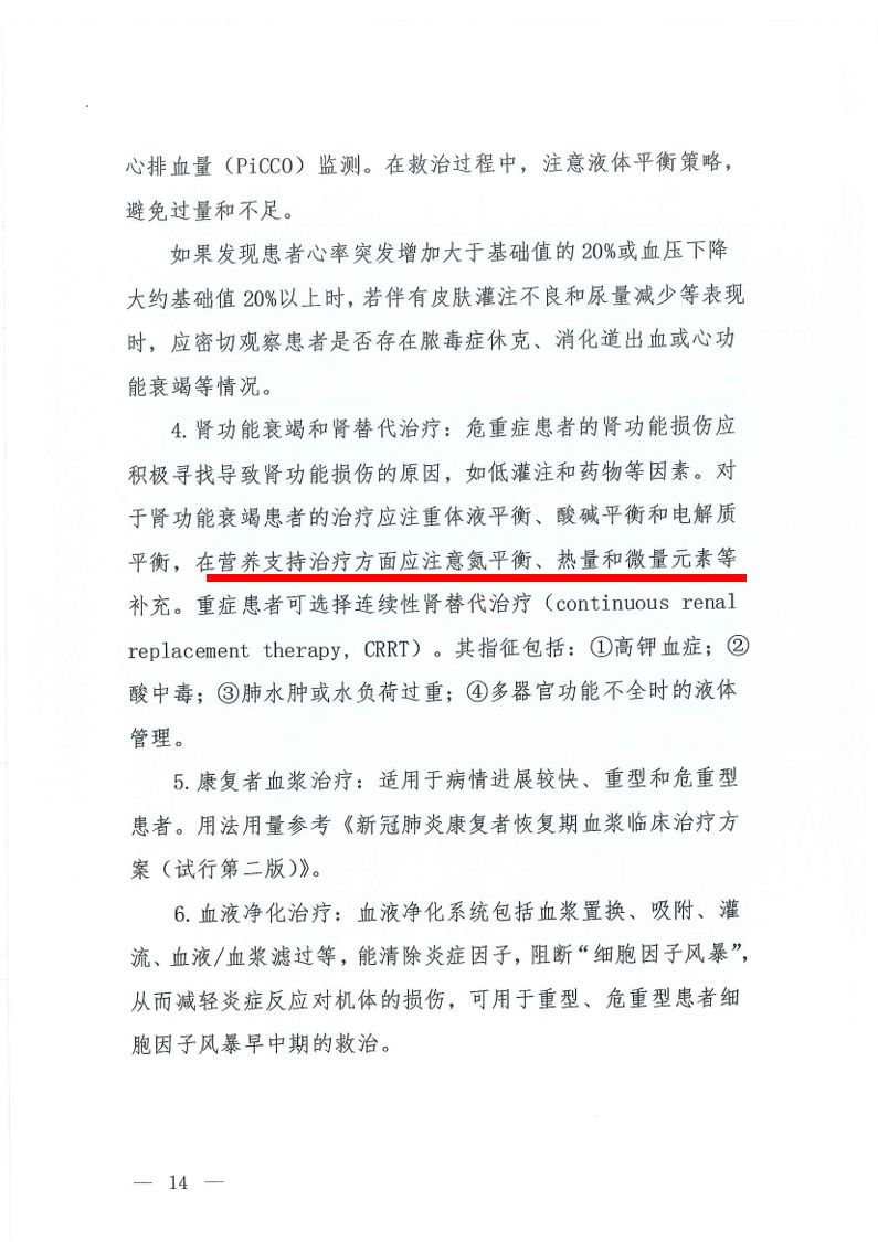另外,在“重症、危重症病例的治疗”中重点提到:在营养支持治疗方面应注意氮平衡、热量和微量元素等补充。