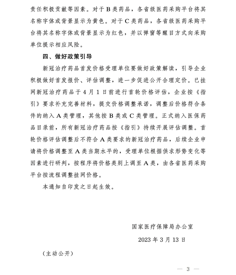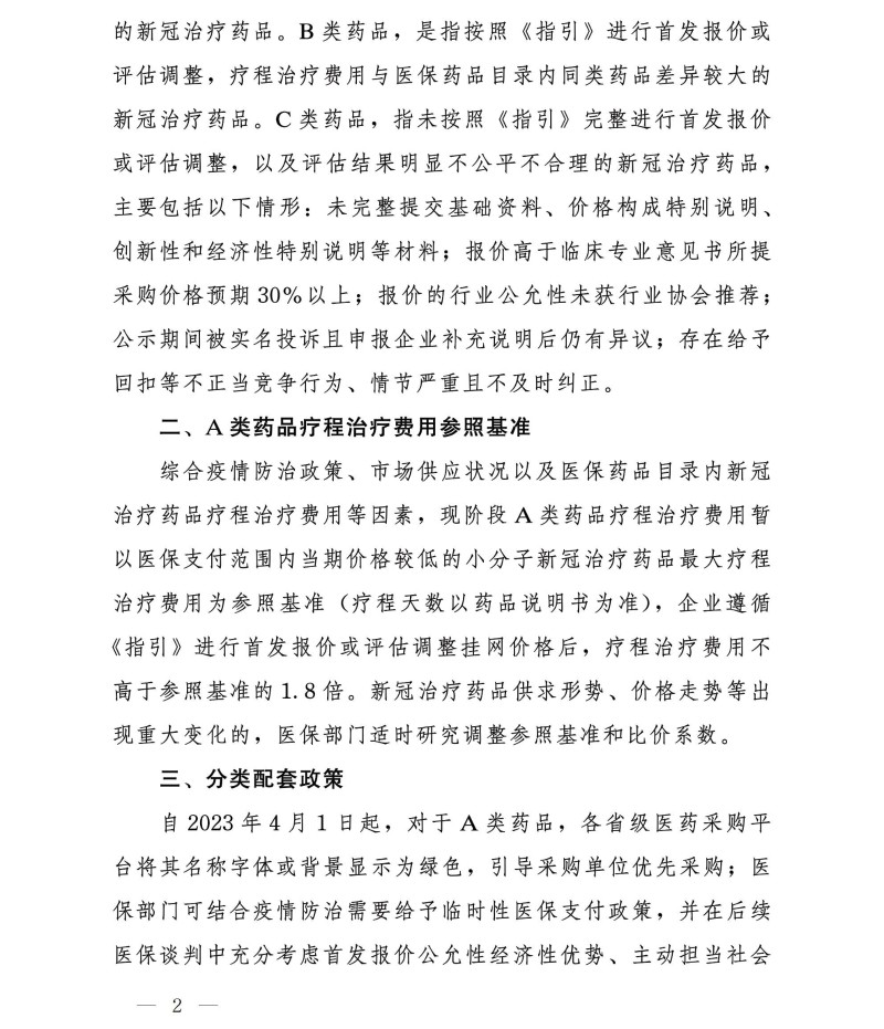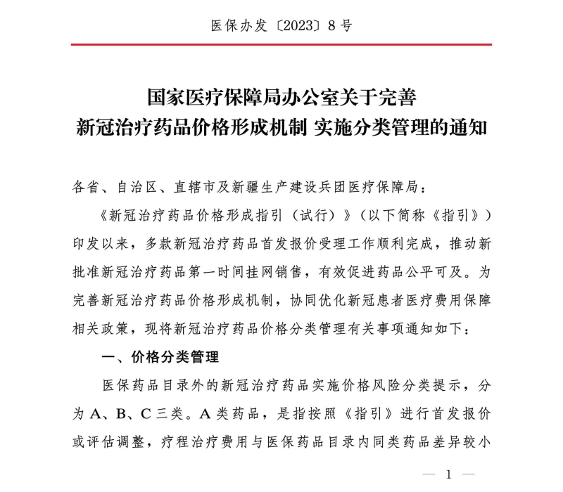 国家医疗保障局办公室关于完善新冠治疗药品价格形成机制实施分类管理的通知